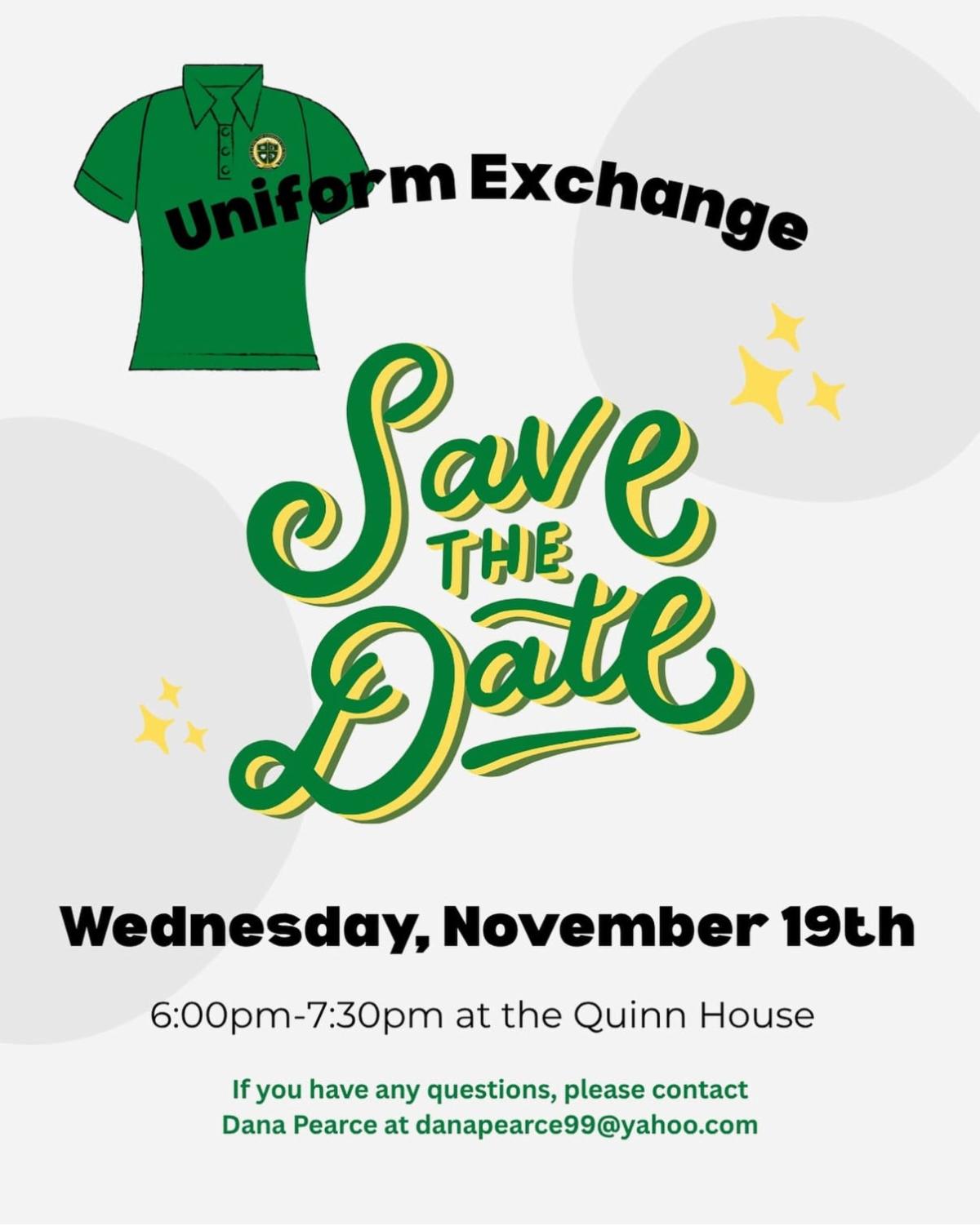 SAVE THE DATE for our Uniform Exchange this Wednesday, November 19th in the Quinn House. This will be the last Uniform Exchange until March!