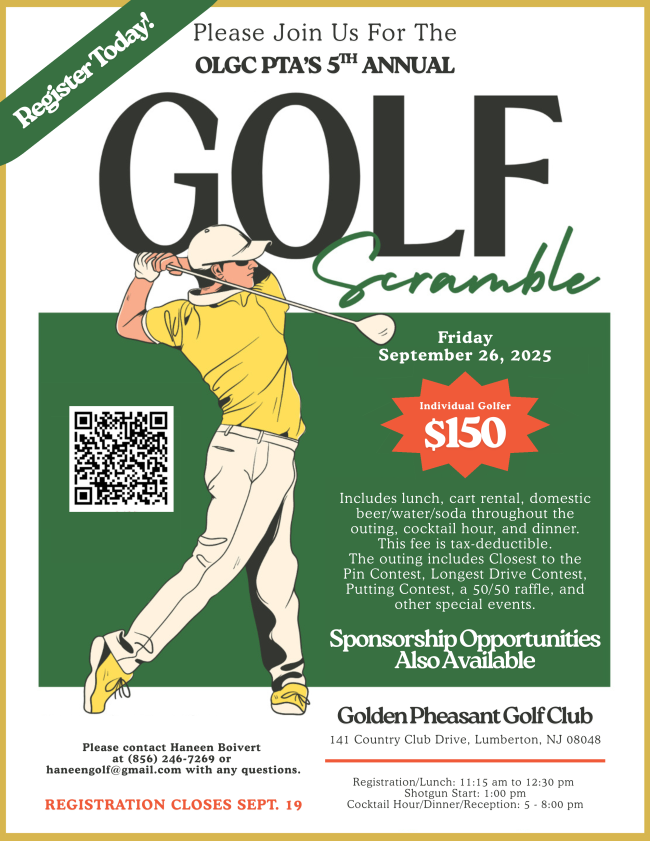 Registration is OPEN for our Annual Golf Outing! Come on out Friday, September 26th to the Golden Pheasant Golf Club for a fun day on the greens. All proceeds support the OLGC PTA and there are many sponsorship opportunities available. The last day to register to golf is Friday, September 19th. For all the details and to register, please CLICK HERE.