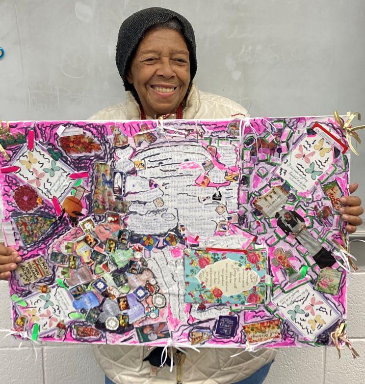 Virginia Lewis, pictured, was inspired by attending OLLI collage classes to create this poster for the bus driver captain at her church. "Ms. Layfield and her sister have invited me into their family," Virginia said. "They invite me to dinner, provide rides, companionship, and love." Virigina wants them to know how much they mean to her and created this poster to tell them just that.