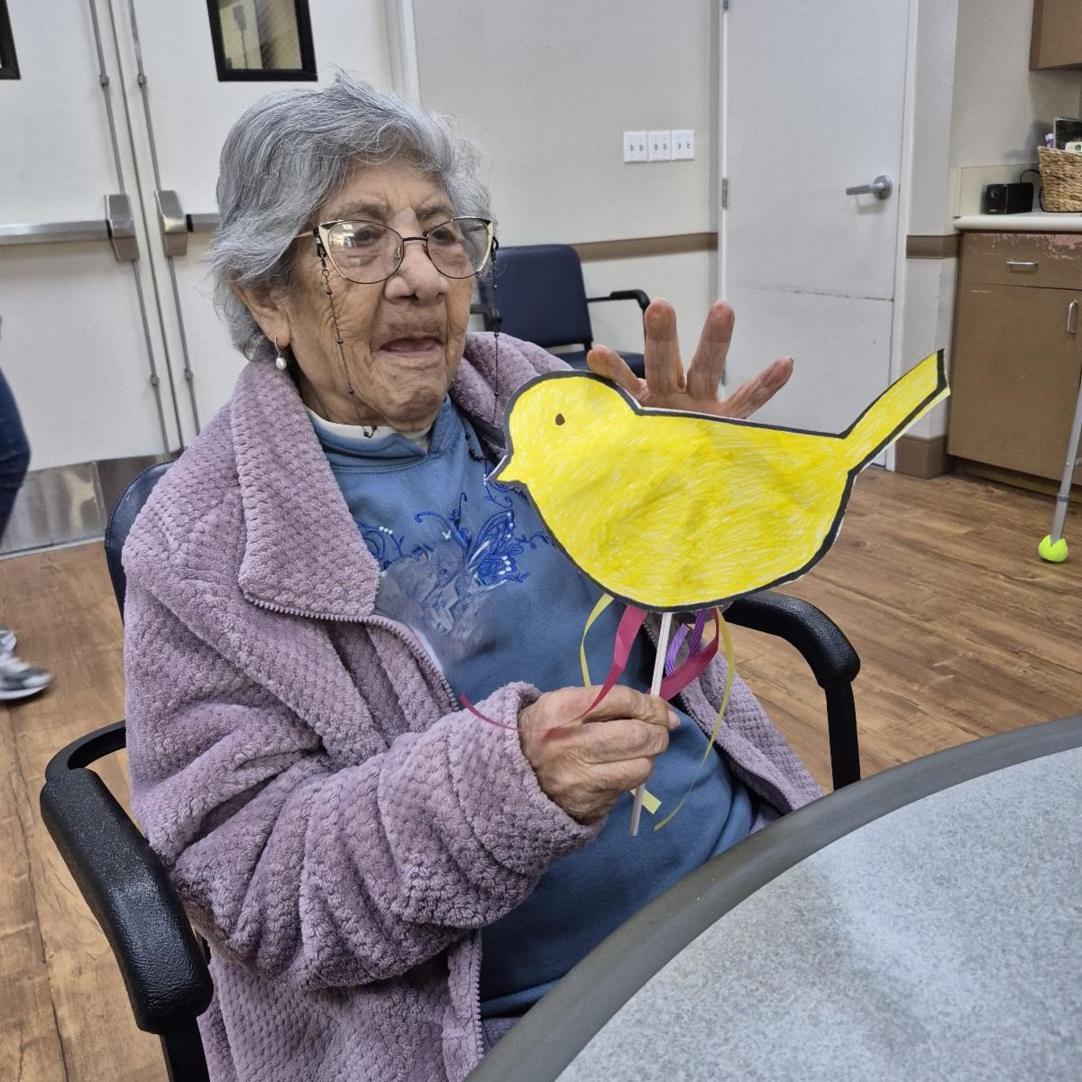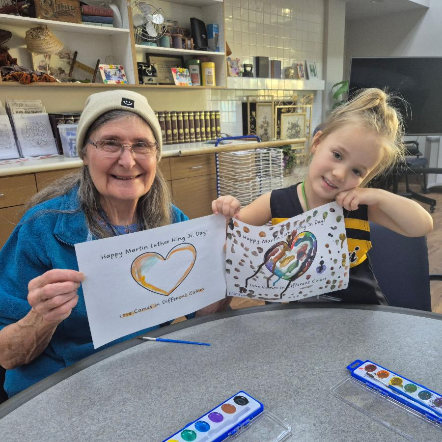 For National Bird Day, the children and older adults worked together to create bird feeders, which are now displayed on our shared patio. In recognition of Martin Luther King Jr., they created a collage and a painting titled “Love Comes in Different Colors.”