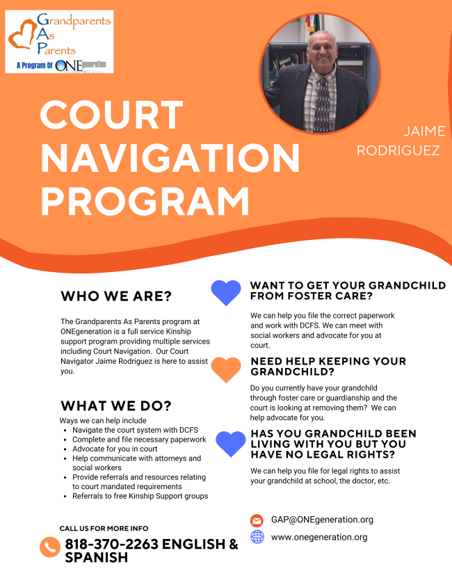 Court Navigation services are available free of charge. Please contact Jaime, ONEgeneration's Court Navigator at 818-370-2263 for an appointment.