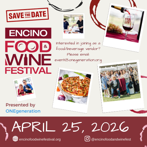 We are excited to announce ONEgeneration’s 3rd Annual Encino Food & Wine Festival, taking place on Saturday, April 25, 2026, from 12:00–4:00 PM at our Encino Farmers Market location (17400 Victory Blvd, Van Nuys, CA 91406).