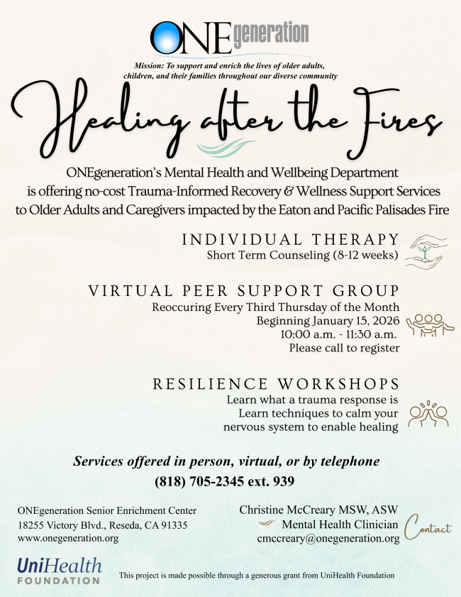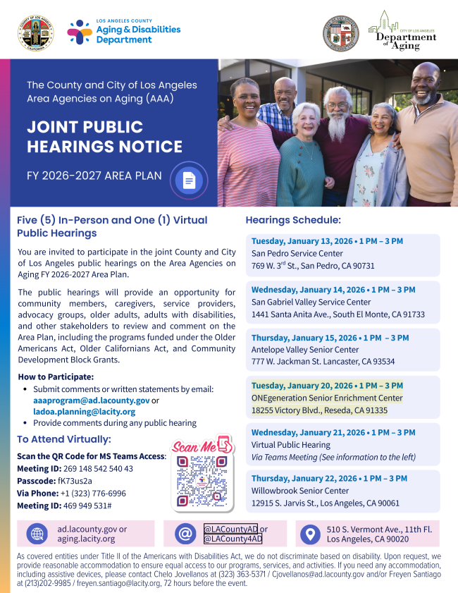The County of Los Angeles Aging & Disabilities (AD) Department, in partnership with the City of Los Angeles Department of Aging (DOA), will be conducting Public Hearings in January 2026 to discuss the FY 2026–27 Area Plan Update. These public hearings will provide older adults, caregivers, and community partners with an opportunity to comment on proposed program changes and service modifications to programs for older adults. ONEgeneration's Senior Enrichment Center will be hosting one of these hearings on Tuesday, January 20th from 1-3 pm at 18255 Victory Blvd., Reseda, CA 91335. We encourage you to attend and give your feedback regarding programs for older adults.