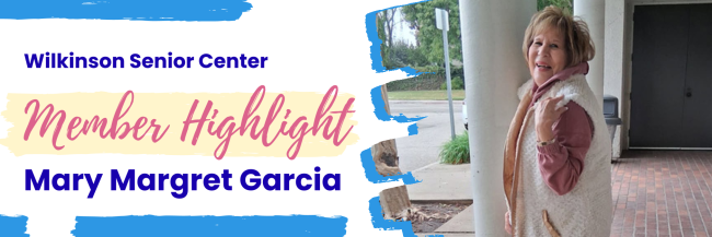 | | | | Senior Center Member of the Month | | | Mary Margret Garcia is a member of Wilkinson Senior Center, and a volunteer. Mary Margret is known as M&M as we have many Mary’s in the center! She is a mother and a grandmother. Her son David lives close by, and she is proud Nana to his two girls. M&M enjoys cooking Italian food and enjoys a good meal out. Mary spends her free time volunteering when she is not working out at the SilverSneakers classes, Boxing and Dance, or Yoga chair exercises to name a few. M&M has been busy this holiday season helping with decorations, stuffing bags of candy, helping with bread sales, selling snowflakes, working the parties, and additional administrative tasks. M&M likes to keep busy at the center but also several charities in the community, especially involving kids. We appreciate you and all you do at the center! | |