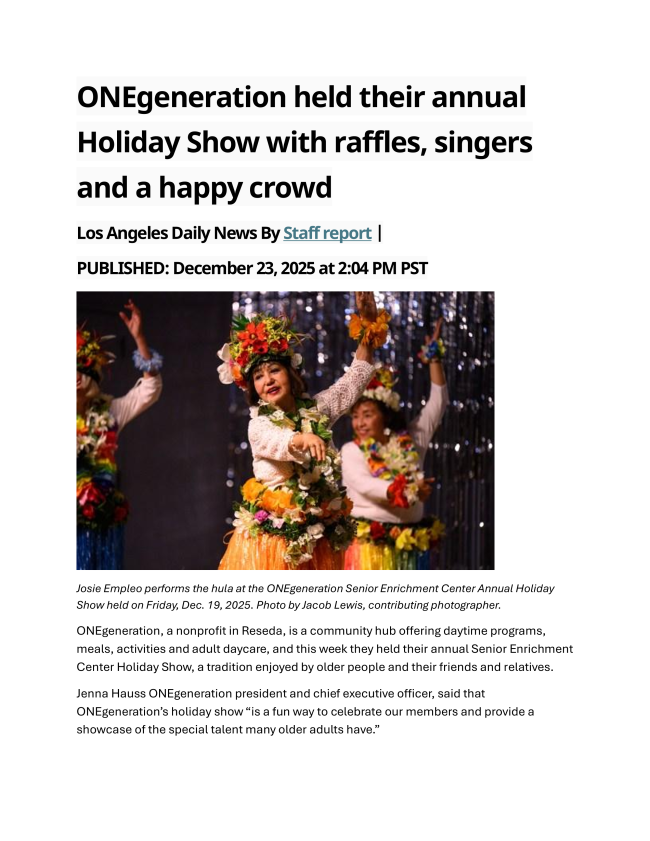 ONEgeneration’s Annual Holiday Show was highlighted in the Los Angeles Daily News. Click here to see the article highlighting the talented dancers and singers who performed on Friday 12/19 at ONEgeneration's Senior Enrichment Center in Reseda.