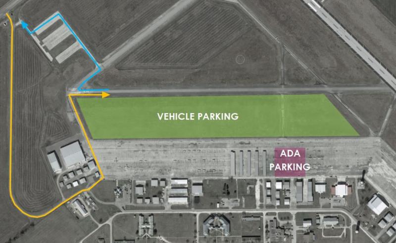 Visitors will enter Airport Drive and continue straight through the gate where Berry Aviation typically keeps their fuel trucks. During the event hours, Airport Drive will be one-way to allow for two lanes of inbound traffic.