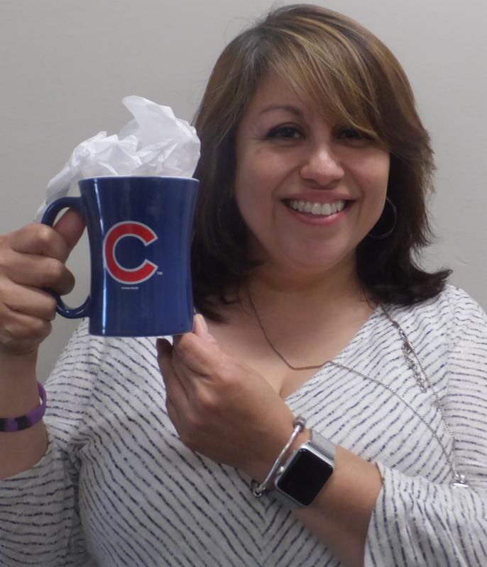 Winners are randomly selected from the Connections subscribers list, like Maria Rosales, employed with the Chicago Department of Aviation, who won a licensed Chicago Cubs mug donated by Hudson News & Gifts. The next winner could be you!