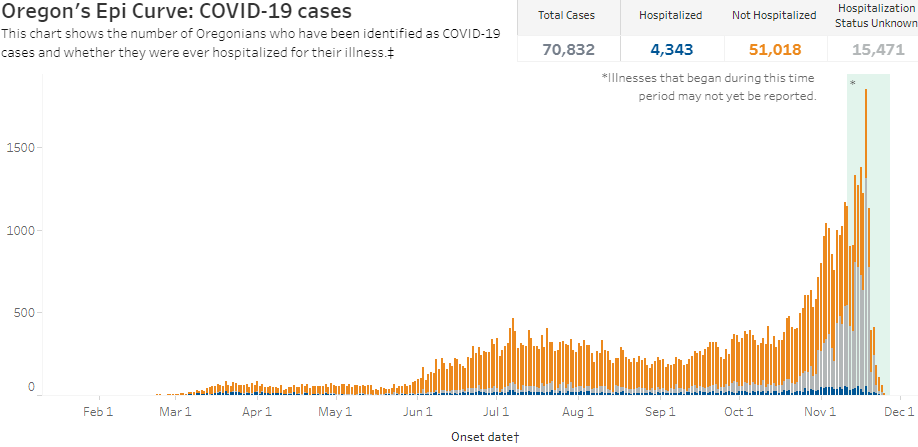 More than 1,300 cases a day were reported in the weekend days before Thanksgiving, and the week of Thanksgiving saw the highest daily reported number of deaths. As of Nov. 30, the Oregon Health Authority (OHA) reported 75,431 positive cases and 912 deaths.
