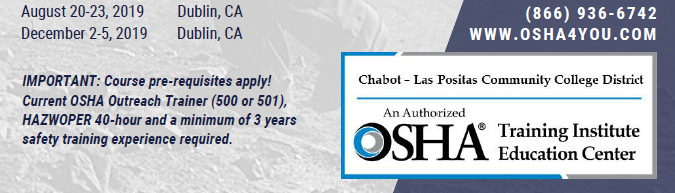 at Chabot-Las Positas Community College District currently offers high quality OSHA standards-based training for construction, maritime and general industry at our locations in the San Francisco Bay Area as well as in Central and Southern California, Nevada and Hawaii. Programs offered include OSHA safety standards, Outreach Trainer courses, Cal/OSHA standards curriculum, environmental courses and customized onsite safety training.