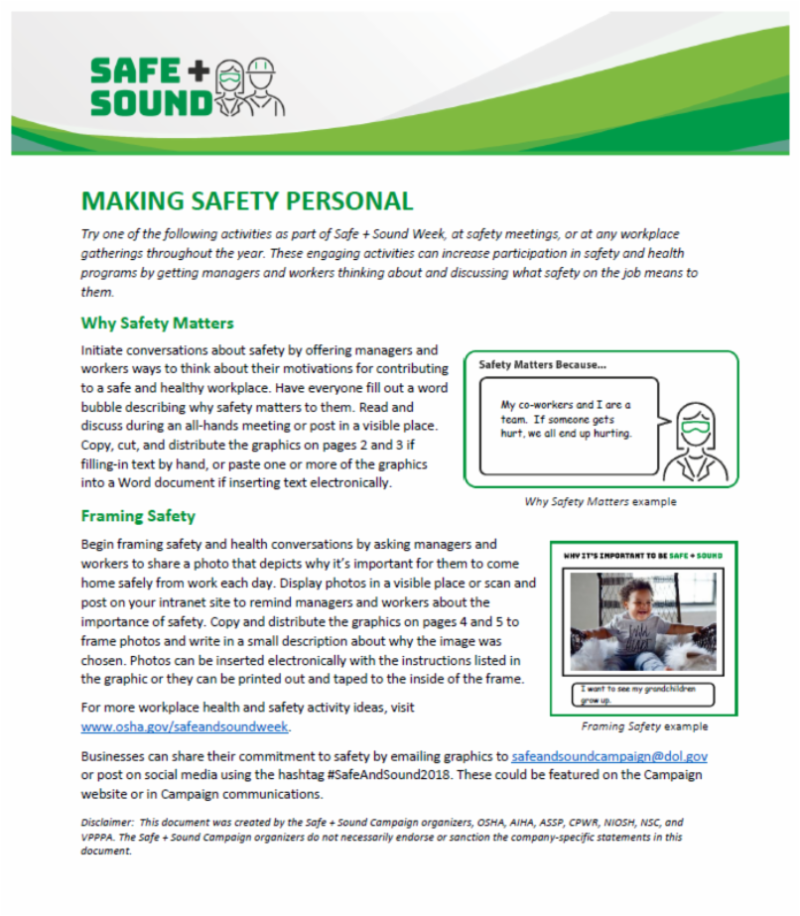 Try one of the following activities at safety meetings or any workplace gatherings throughout the year. These engaging activities can increase participation in safety and health programs by getting managers and workers thinking about and discussing what safety on the job means to them.