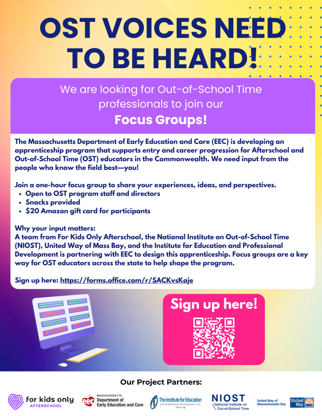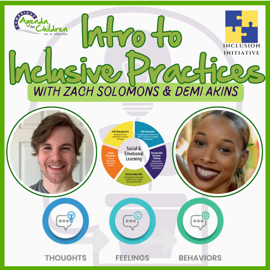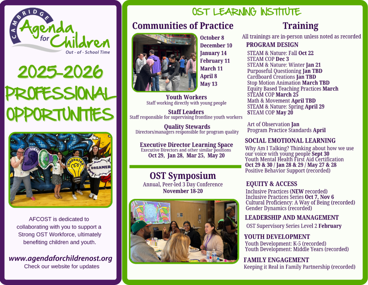 This year we will be offering training in Program Design in partnership with the STEAM Initiative, and will continue to offer Social Emotional Learning opportunities for certifications in Youth Mental Health First Aid in partnership with Cambridge Public Health Department, and explore Equity and Access through Inclusive Practices in OST Programs in partnership with the Inclusion Initiative. Keep checking our event calendar for new training opportunities facilitated by familiar and new faces.