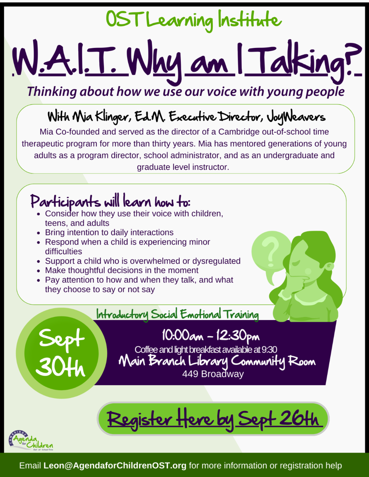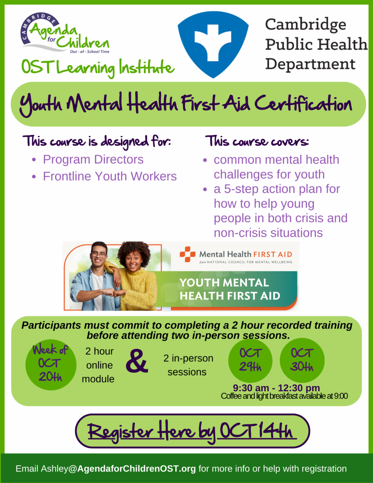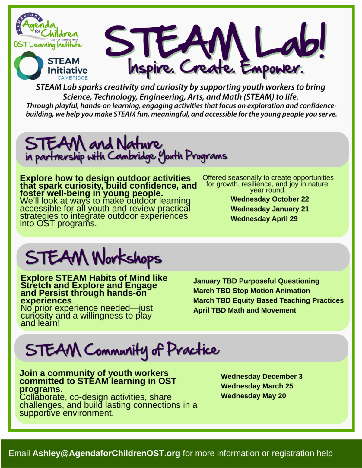 This year we will be offering training in Program Design in partnership with the STEAM Initiative, and will continue to offer Social Emotional Learning opportunities for certifications in Youth Mental Health First Aid in partnership with Cambridge Public Health Department, and explore Equity and Access through Inclusive Practices in OST Programs in partnership with the Inclusion Initiative. Keep checking our event calendar for new training opportunities facilitated by familiar and new faces.