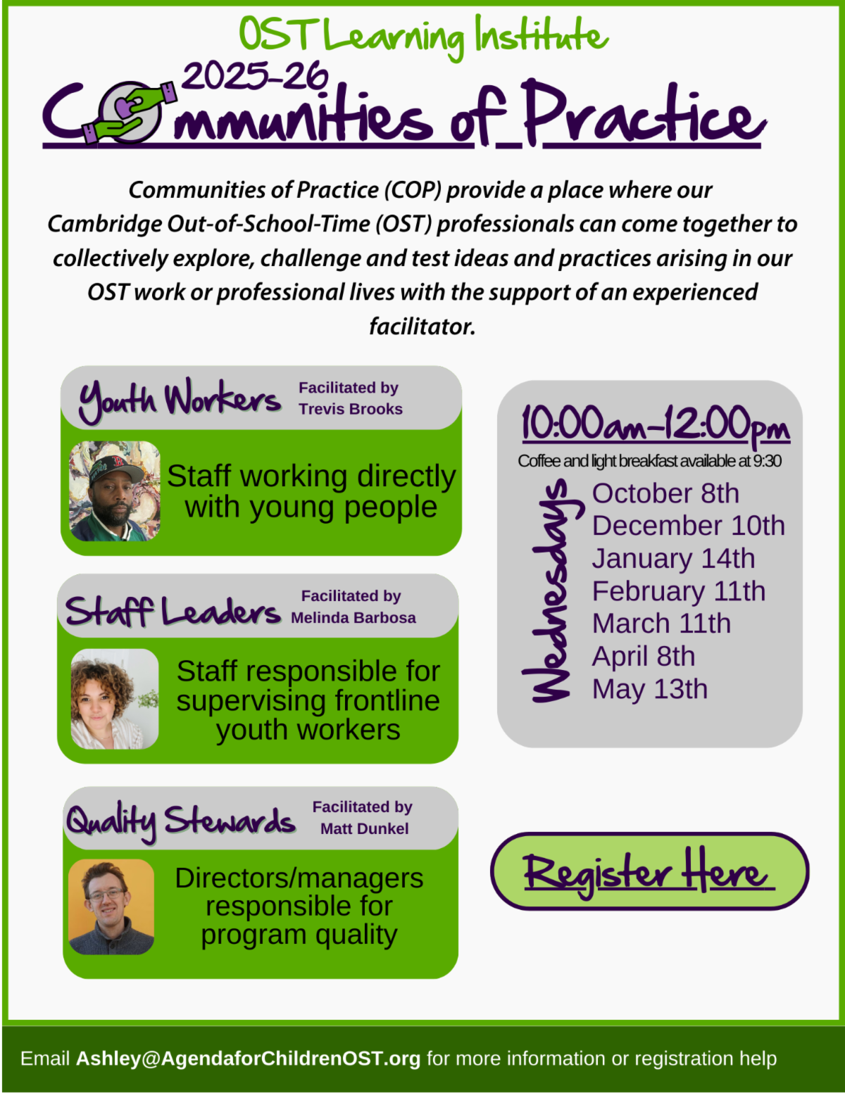 Communities of Practice kick off on October 8th at the Moses Youth Center, and we can’t wait to see you there! Trevis, Melinda, and Matt will begin facilitating at 10:00 AM. Plan to arrive early to find parking, grab a light breakfast, and settle in—coffee and breakfast will be available starting at 9:30.
