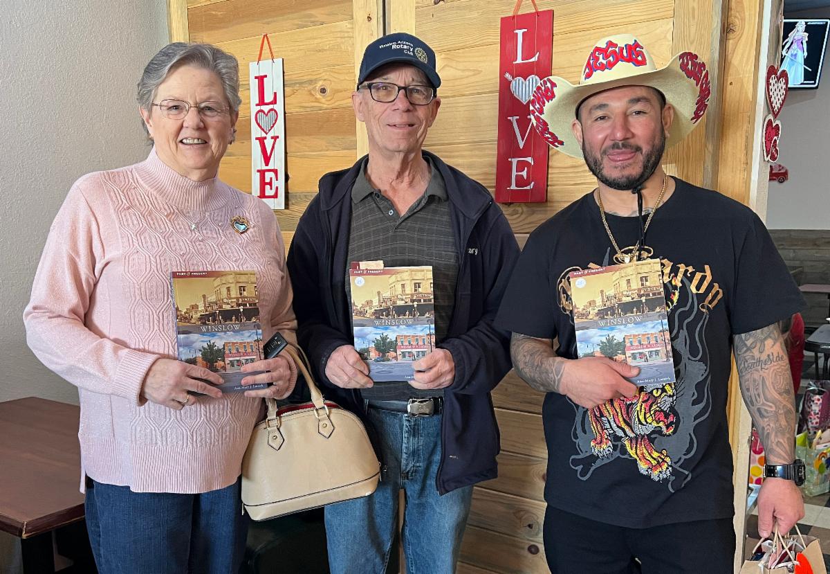 The Rotary Club of Winslow invited OTM Director Ann-Mary Lutzick to give a book talk on the museum’s new title, Past & Present: Winslow, on February 12, during their weekly meeting at Bojos Grill and Sports Club. Among the club’s thirteen attendees were Secretary Erna Snukis, Treasurer Kevin Cox, and Arthur Brito (above). Past & Present: Winslow, which illustrates the city’s development through historic images of buildings alongside contemporary photos, is available at the museum ($25) and OTM Online Store (plus $5 for shipping). OTM greatly appreciates the Rotary’s support, which also includes repeat ads in our annual historical calendars like this year’s Winslow in the 1960s.