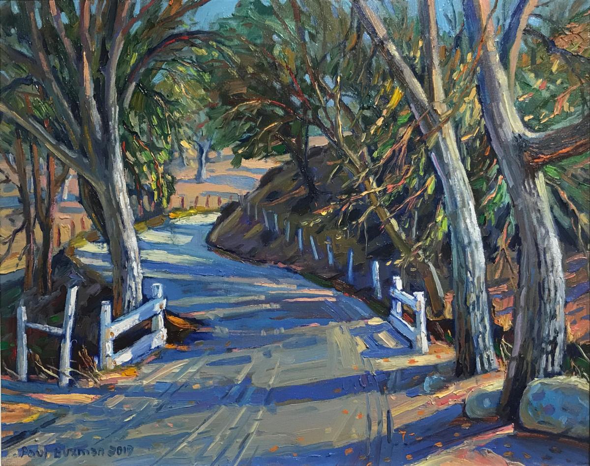 But it is not the Pop Art of Thiebaud (though he notoriously distances himself from the label) that drives Buxman’s art but rather Impressionism, which as a contemporary movement may have breathed its last well more than a hundred years ago. But Buxman keeps the style alive and vigorous, doing it more than justice. Monet and the Impressionists staked their artistic claim in Europe in the late 19th Century when the Valley was first occupied by European American farmers. Closer to home the California Impressionists imported the style in the early 20th Century. But they derived their inspiration from easy allure of California’s breathtaking coastal terrain and misty atmospheres – not the Valley, which was and remains California’s afterthought as artistic subject matter. That’s especially true for plein air painters, who can find the Valley’s punishing summers and chilly winters to be a tough go out on location where Buxman often works.
