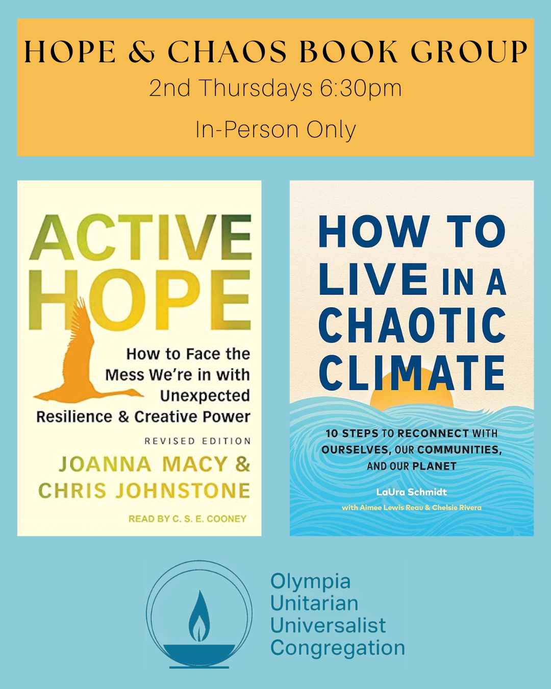 | We are combining our Active Hope and Chaotic Climate book groups into one onsite book group called Hope & Chaos! Join Rev. Mary Gear and Rev. Sara Lewis in-person on the second Thursday of each month at 6:30pm as we reflect on the Work that Reconnects (Active Hope by Joanna Macy and Chris Johnstone) and the 10 Steps of Good Grief (How to Live in a Chaotic Climate by LaUra Schmidt). All are welcome. | | | |