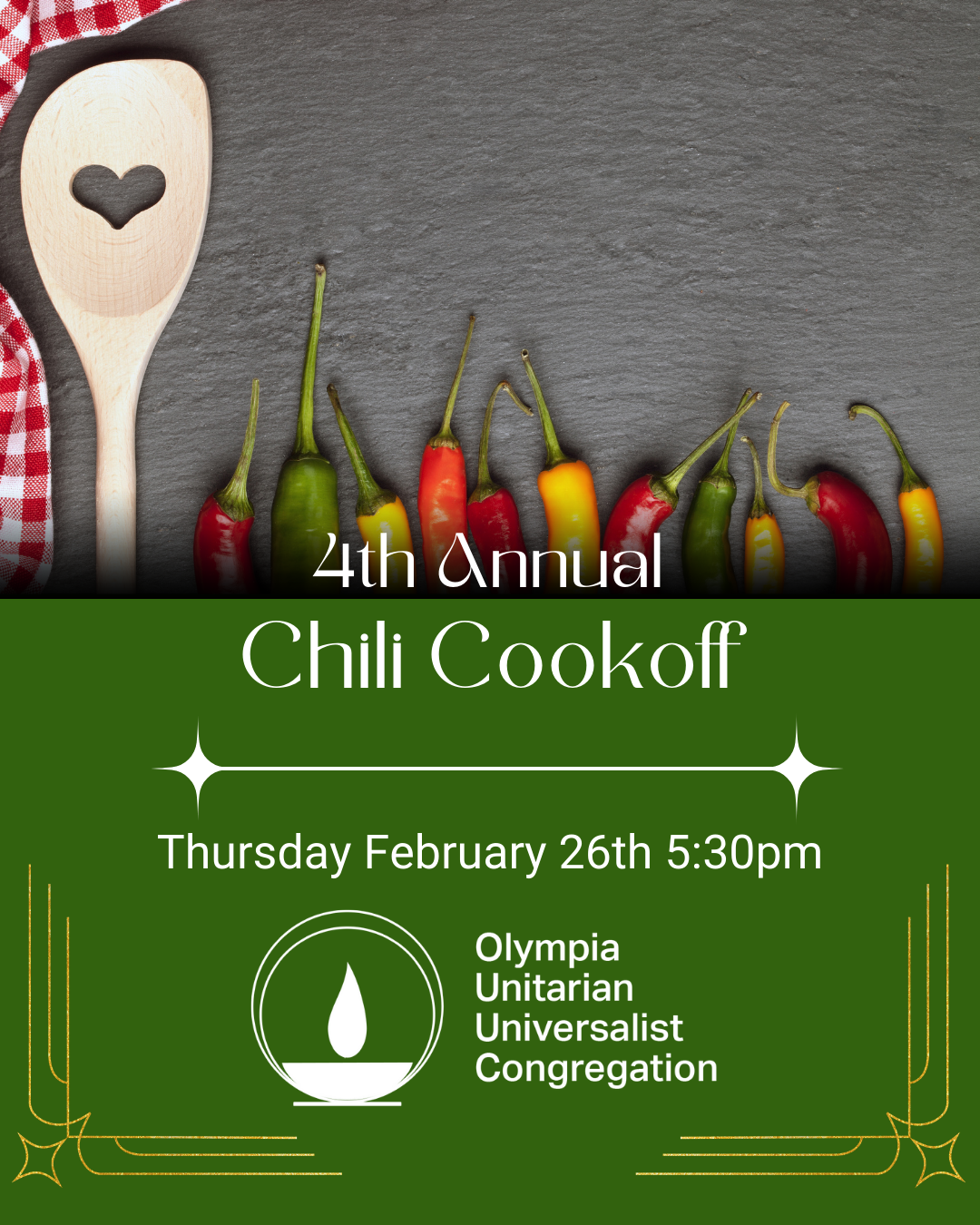 | Dust off your recipes! Our 4th Annual competitive Chili Cookoff will be on Thurs 2/26. We will have voting and prizes for two categories: vegetarian and meat. Let Rev Sara know if you plan to bring a pot of chili. | | | |