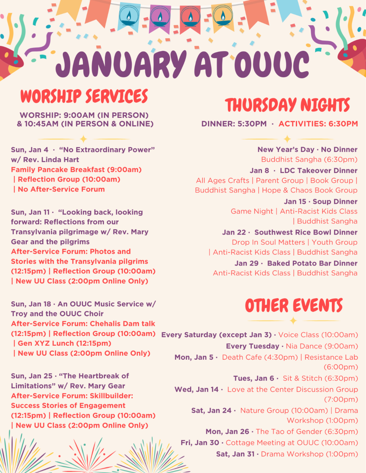 Wed, Jan 28, 6:00pm Fri, Jan 30, 10:00am at OUUC Mon, Feb 2, 7:00pm on Zoom & more