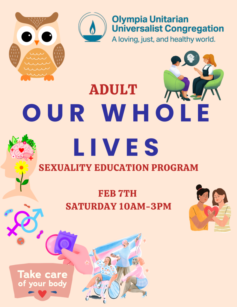 | Join us for the next session in our Adult OWL series! The Our Whole Lives program offers comprehensive, values-based sexuality education and is a beloved program in UU congregations. This workshop will explore attitudes about aging, sexual scripts, and keeping our bodies healthy as we age. All adults are welcome! Register now using the button above. | | | |
