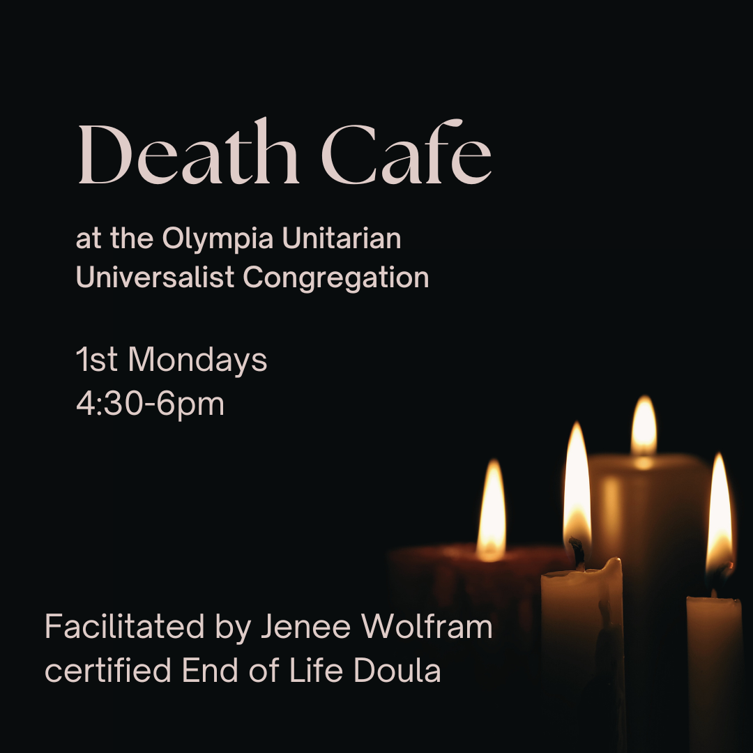 | Join Jenee Wolfram for a group-led, open conversation about all things death and dying in a safe, confidential, and judgment-free space. Come share your thoughts, feelings, and experiences around death. All are welcome. Cake will be served! Death Cafes are intended to be discussion groups rather than grief support/counseling. | | | | |