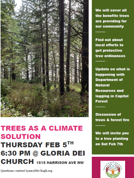 | On Feb 5th at 6:30 pm Restoring Earth Connection will be giving the last of their Climate Challenge talks. The talk Trees As Climate Solutions will go over interesting things about the benefits of trees and move into information about Olympia and Tumwater redoing their tree ordinances this year – what the opportunities and dangers are there and with the County. We will also talk about the cutting of legacy Forests in Capitol Forest that continue under Commissioner Upthegrove. This will be followed by an opportunity Saturday morning the 7th at 10 am to help Tumwater plant about a 100 trees! Contact Lynn@fitz-hugh.org for more info on joining the tree planting. | | | |