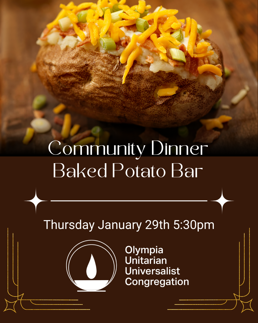 | This week's community dinner menu will be Baked Potato Bar. All are welcome for food and fellowship at 5:30pm at our weekly Thursday community dinners. We need volunteers to help cook starting at 3:30pm, set up tables at 4:30pm, or clean up at 6:30pm. We are getting a bit more formal with a Sign-up Genius so we know who is going to be able to help with dinners. If you can help, please sign up! | | | |