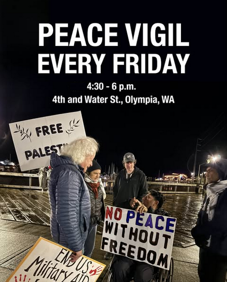 Please join Olympia Fellowship of Reconciliation (FOR) every Friday in a friendly Peace Vigil for whatever length of time you can. Olympia FOR’s Friday Vigils have been occurring for decades and are now joined by other groups including The Rachel Corrie Foundation for Peace and Justice and peaceful individuals who continue to advocate and stand together for peace, a permanent ceasefire, an arms embargo, and justice for Palestine. Peace signs are provided.