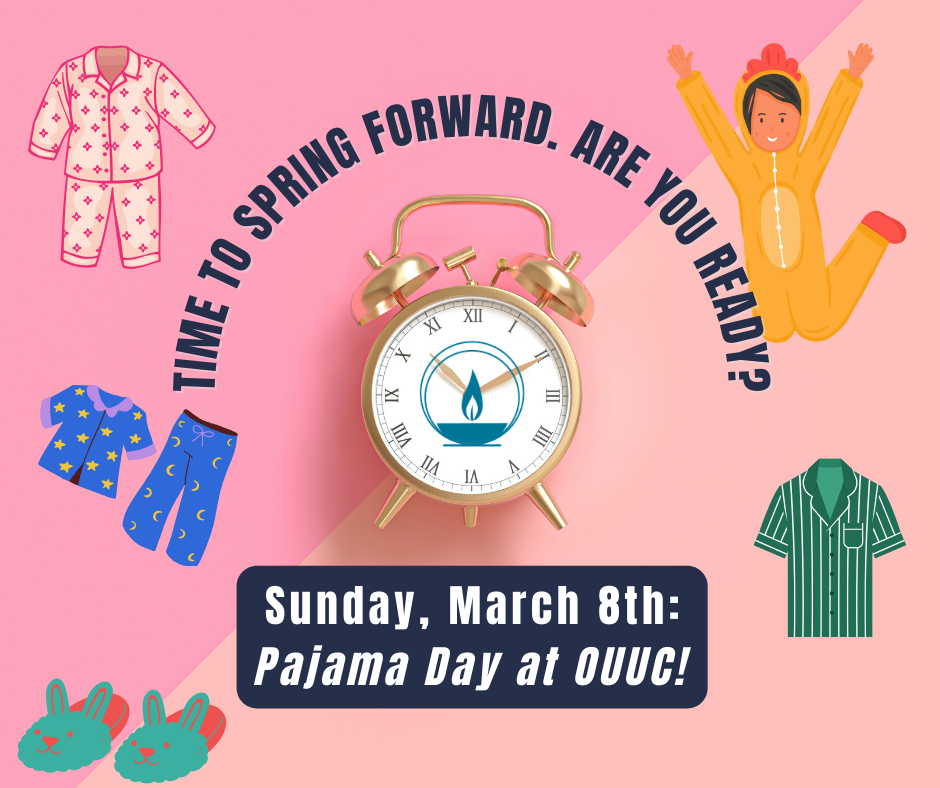 Daylight Saving Time begins this Sunday, March 8. Don't forget to set your clocks forward Saturday night! Since we're all losing an hour of sleep, come to Sunday service in your favorite pajamas. We'll spring forward together in comfort!