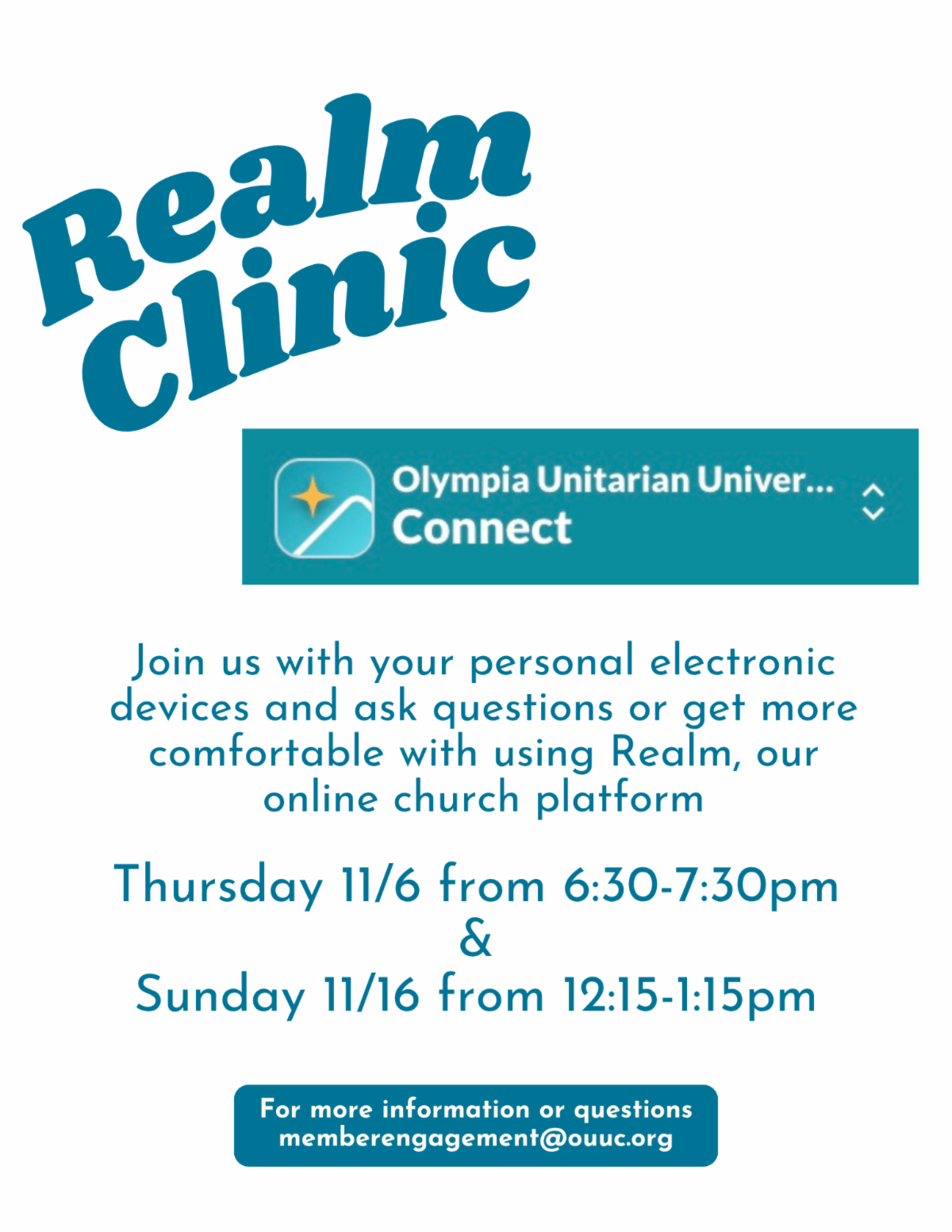 | Join us on Sunday November 16th from 12:15 PM - 1:15 PM with your personal electronic devices to ask questions or become more comfortable with using Realm. Please contact Chloe Meyer (memberengagement@ouuc.org) for more information. | | | |