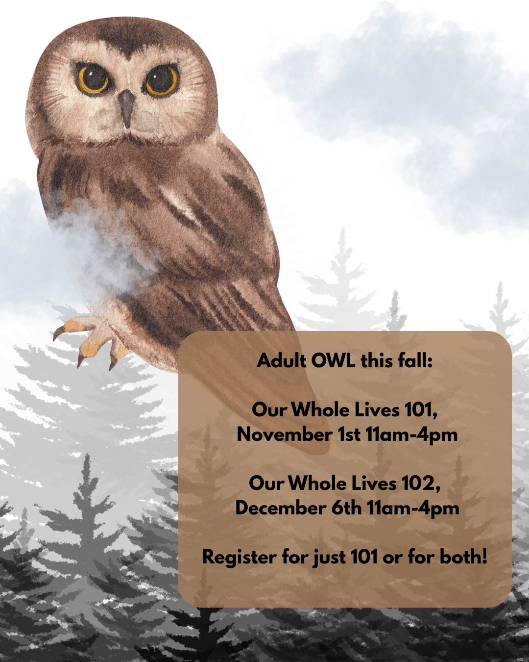 | The Our Whole Lives program offers age-appropriate, comprehensive, values-based sexuality education and is a beloved program in UU congregations. The second session of our two-day Adult OWL fall workshop series, Our Whole Lives 102, will be held on December 6th from 11:00 AM - 4:00 PM. Contact Rev. Sara at dcfd@ouuc.org with any questions. | | | | |