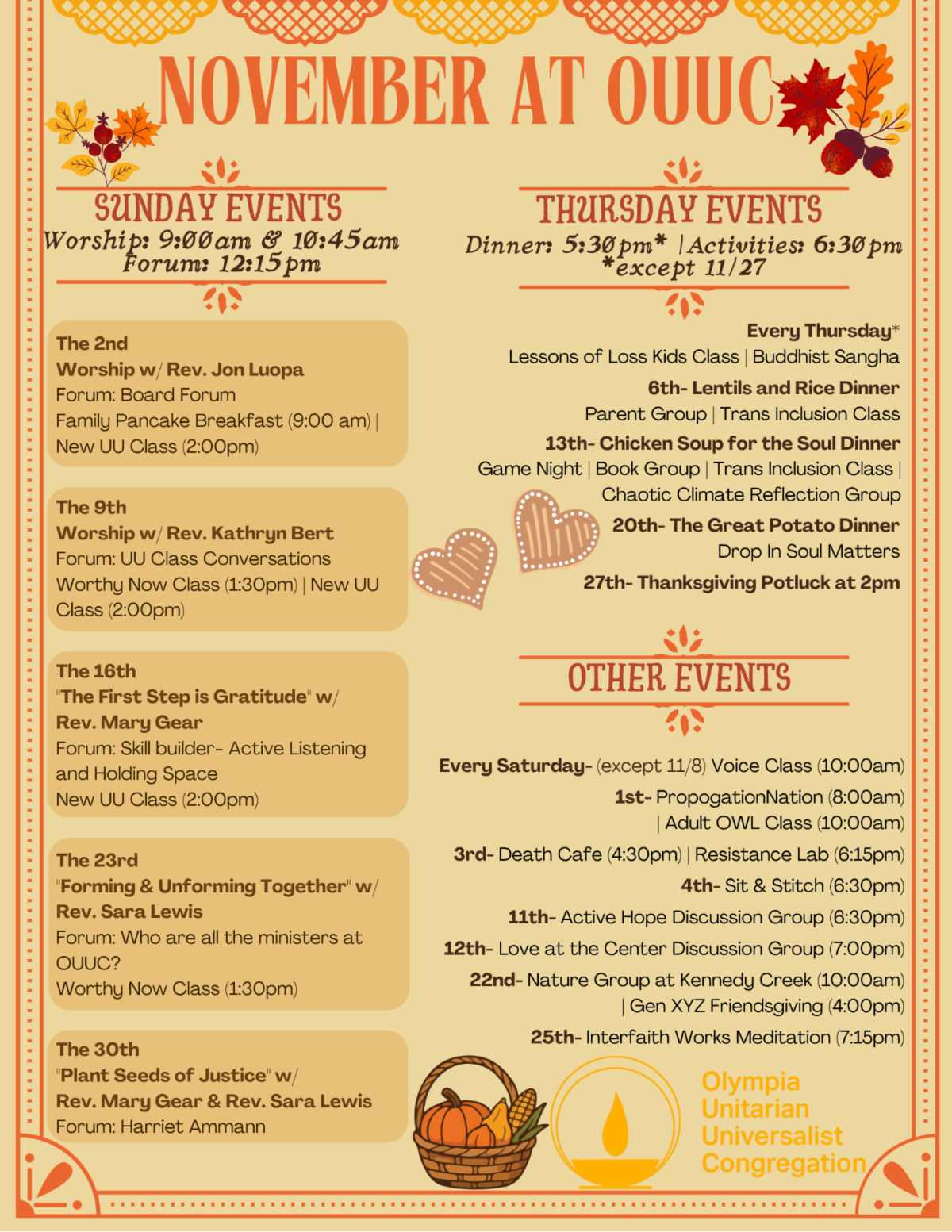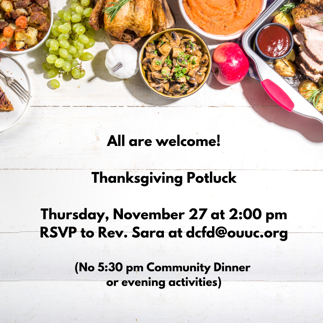 | All are invited to join us for our annual Thanksgiving Potluck on November 27th at 2:00 PM. Please RSVP with the button above! This will be in lieu of our regularly scheduled Thursday community dinner and evening activities for the fourth week of November. | | | |