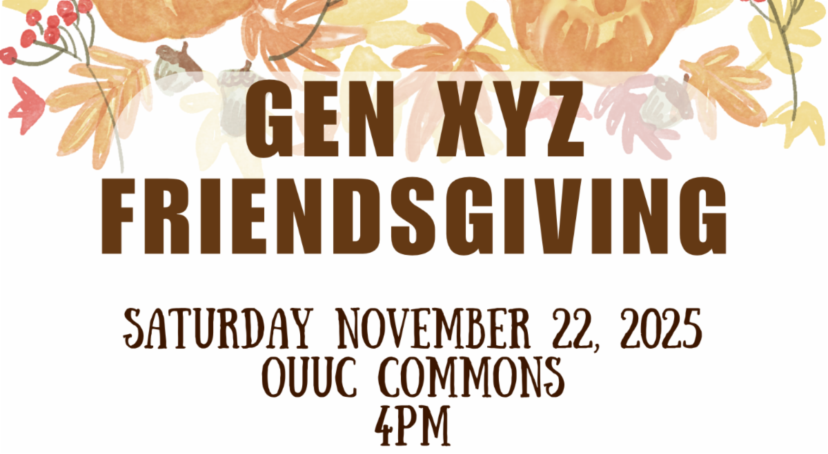 | November’s Gen XYZ lunch on November 16th is canceled; come to Friendsgiving instead!! Friendsgiving will be a potluck coordinated by Kedo Baye and Rebecca Jewell. Click the button above to sign up to bring an item or help with set up, tear down, and/or dishes. If this is a barrier for you, please just come and enjoy food and fellowship, no questions asked. If you need help signing up or have questions, contact Kedo Baye. | | | |
