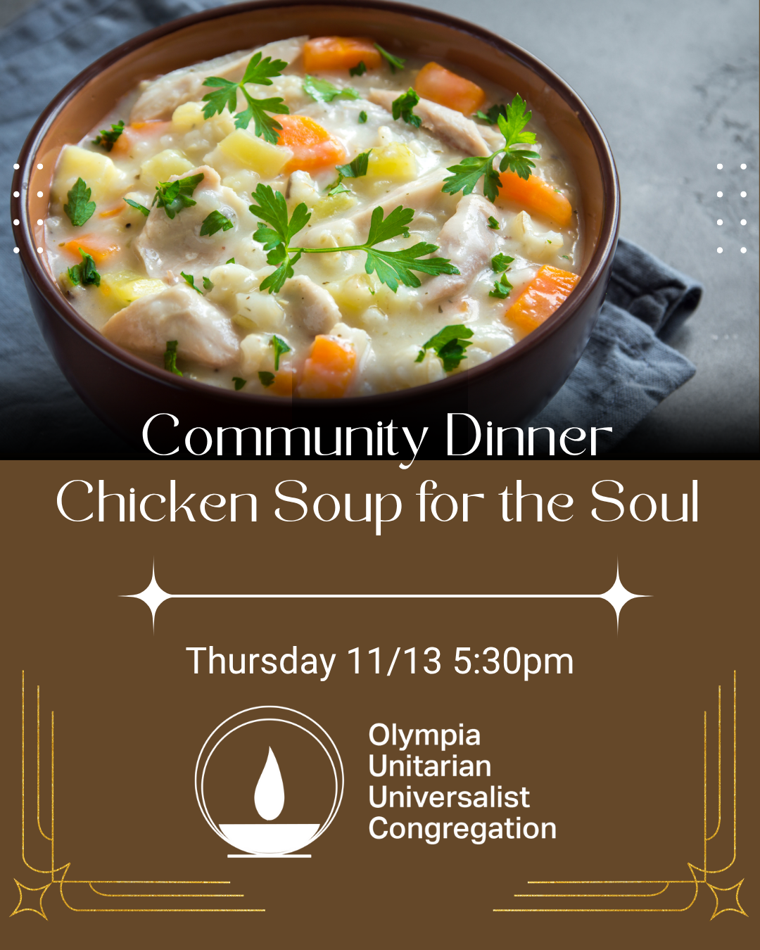 | This week's dinner theme will be Chicken Soup for the Soul. All are welcome for food and fellowship at 5:30pm PM at our weekly community dinner on Thursdays. If you can volunteer to help cook starting at 3:30 PM or set up tables at 4:30 PM, or clean up after at 6:30 PM, we are getting a bit more formal with a Sign-up Genius so we know who is going to be able to help with dinners. If you can help, please sign up. | | | |