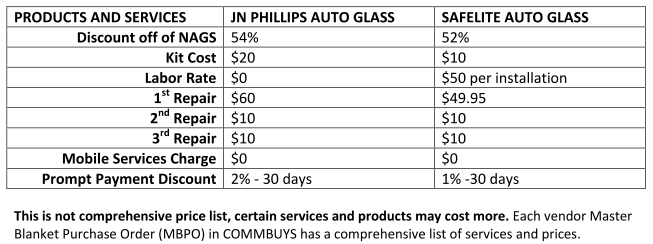 New contract effective July 1, 2016. Two vendors, JN Phillips and Safelite, are now on contract.