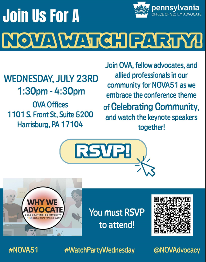 OVA is hosting a NOVA Watch Party on July 23 from 1:20-4:30. We welcome anyone interested in hearing the Keynote Speakers to spend the afternoon with us in our space.