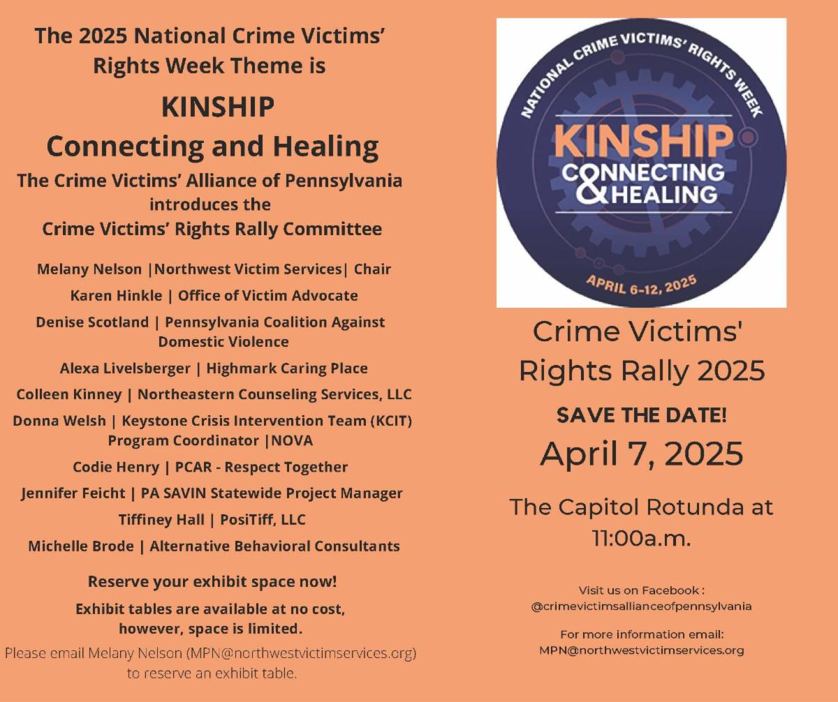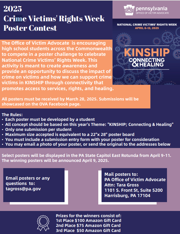 The next OVS Newsletter will be published on March 26, 2025. If you would like any training events, fundraisers, or notable news published in this newsletter, please submit them to Lea Dorsey at ledorsey@pa.gov by March 19, 2025.