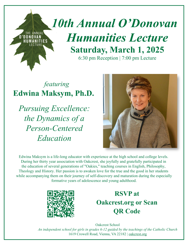 10th Annual O'Donovan Humanities Lecture tomorrow, Saturday, March 1, featuring Edwina Maksym, Ph.D., life-long educator and former Oakcrest teacher. Her presentation is titled, Pursuing Excellence: the Dynamics of a Person-Centered Education.