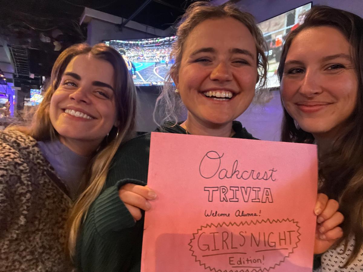 For the first time, alumnae gathered in-person for our annual Alumnae Trivia Night. Tara (Hill '11) Van Zoeren hosted the event at Caddie's in Bethesda. Alumnae from the classes of 2011, 2012, 2016, and 2018 gathered for a competitive evening with trivia questions in various categories, including: Women in Pop Culture, Women in History, Oakcrest History, and "You should have learned this at Oakcrest." The winning team: Sheila Hill '16, Katie (McNeish '16) Hill and Meg Gargulinski '11 each received a $25 Amazon gift card. Congratulations, ladies!