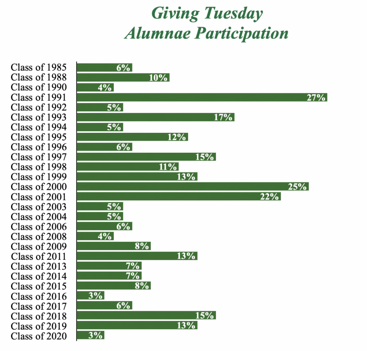 First, I’d like to extend a big thank you to all of you who graciously gave back to our alma mater this Giving Tuesday. We set a goal of $2600 (the match amount donated by the OAA Board), and we surpassed it thanks to all of you and your generosity! The Class of 1991 is currently in the lead with the highest percentage of class participation, however, there is still time to help your class increase their participation numbers. More donations have been coming in since Giving Tuesday as you will see in our updated graphics, and so we have decided to keep the challenge going until the end of the year! If you weren’t able to make a donation on Giving Tuesday, no need to worry, you still have time. You may do so now by clicking here. All alumnae donations truly matter (and count); no gift is too small! Don’t forget to check out next month’s issue of OakLink where we will acknowledge the winning class!