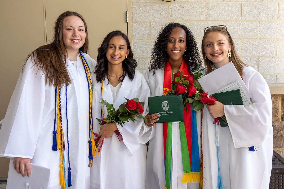 On commencement day, just like at some of the very first Oakcrest graduations years ago, graduates are dressed in white caps and gowns and are given a bouquet of red roses. The ceremony features an invocation from the school chaplain, Head of School remarks, a Commencement speaker, reflections and remarks delivered by the Valedictorian and Salutatorian.