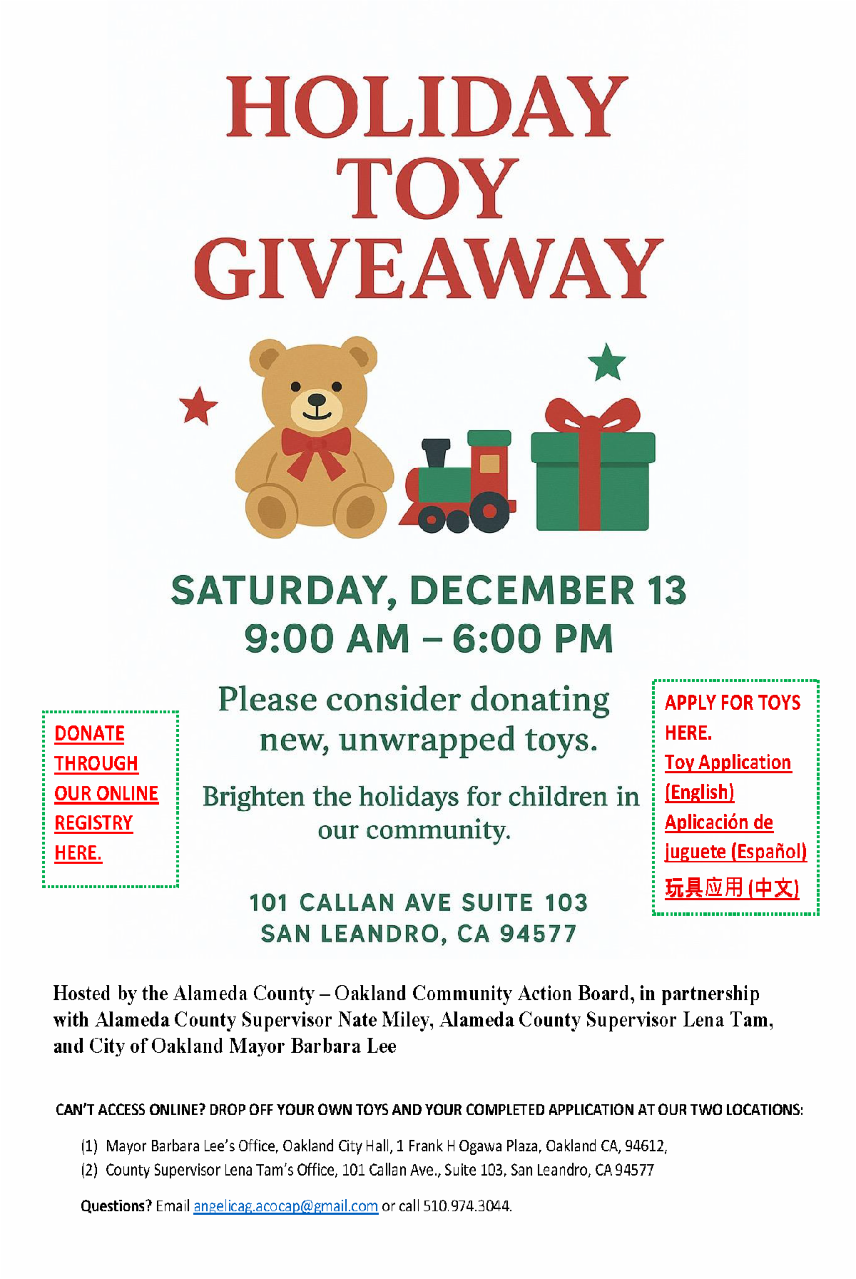 - Details: Join Supervisor Lena Tam and Mayor Barbara Lee for a Holiday Toy Giveaway hosted by the Alameda County Oakland Community Action Partnership. Families can apply to receive toys and supporters can donate through the online registry.