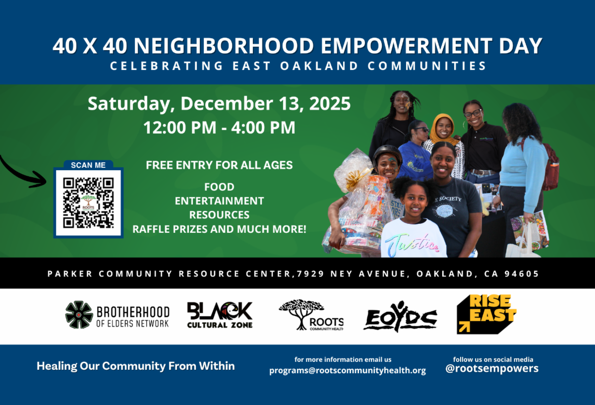 Details:Join Roots Community Health and community partners for the 40 x 40 Neighborhood Empowerment Day, a free, family-friendly celebration uplifting East Oakland communities. Enjoy food, entertainment, community resources, raffle prizes, and more—all at no cost and open to all ages. This event brings together local organizations dedicated to healing and strengthening our community from within. For more information, email programs@rootscommunityhealth.org or follow @rootsempowers on social media.