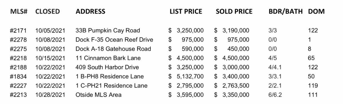 In October there were 8 Closed Properties: 3 Homes, 3 Condos and 2 Docks. There are currently 51 Active Real Estate Listings of which 19 are at the Residence Club. This is again one of the lowest amount of listings at Ocean Reef.
