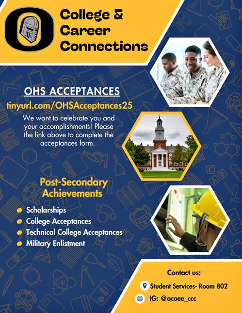 Seniors, we want to celebrate your achievements! Please update us on any college acceptances, scholarship awards, or military enlistments using this form: https://tinyurl.com/OHSAcceptances25 | |
