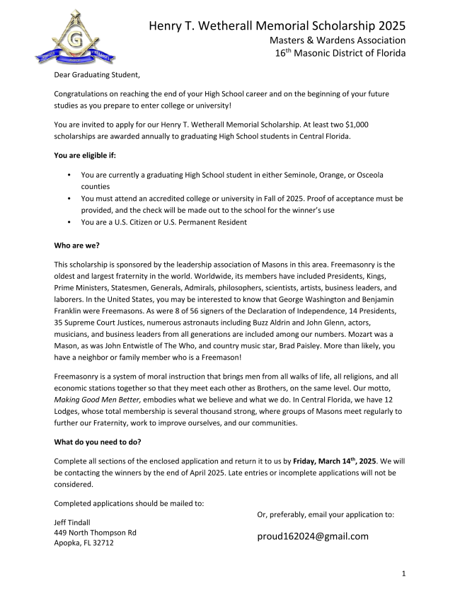 Henry T. Wetherall Memorial Scholarship (page 1 screenshot below - Application here) | |