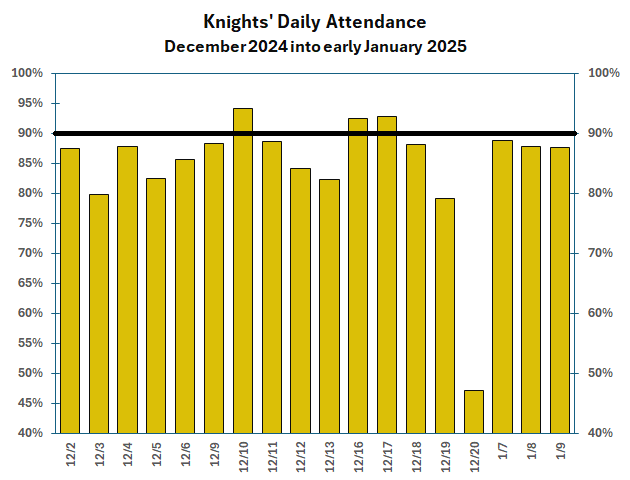 There was more volatility than usual with our Knights' attendance during December due to Progress Monitoring Assessments (PM2 on Dec. 10, 16, 17) where attendance jumped well over 90% and then during the two days leading up to the winter break (Dec. 19 and 20) when attendance slipped.
