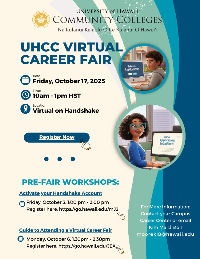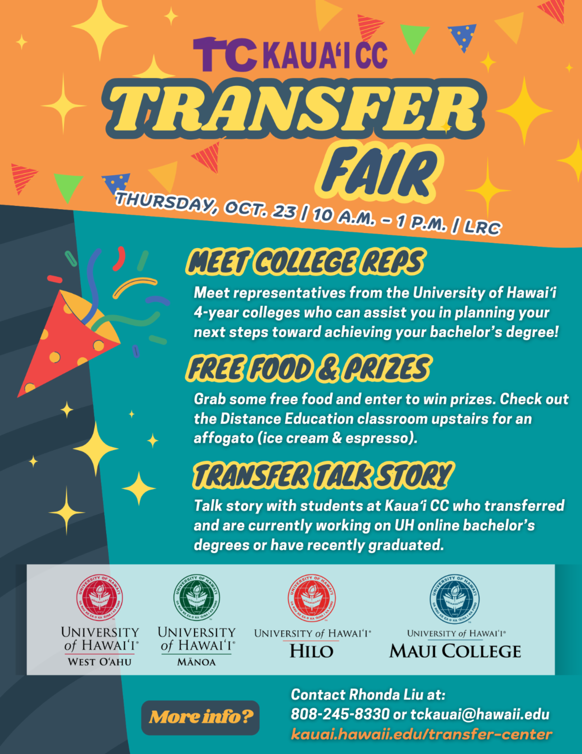 Visit the Learning Resource Center on Thursday, Oct. 23, for the 2025 Transfer Fair! Meet college reps from the 4-year UH colleges to discuss pathways to get your bachelor's degree. Talk story with students who are currently working on their bachelor's degree through distance education, win prizes, learn more about the distance education classroo,m and grab some free food!