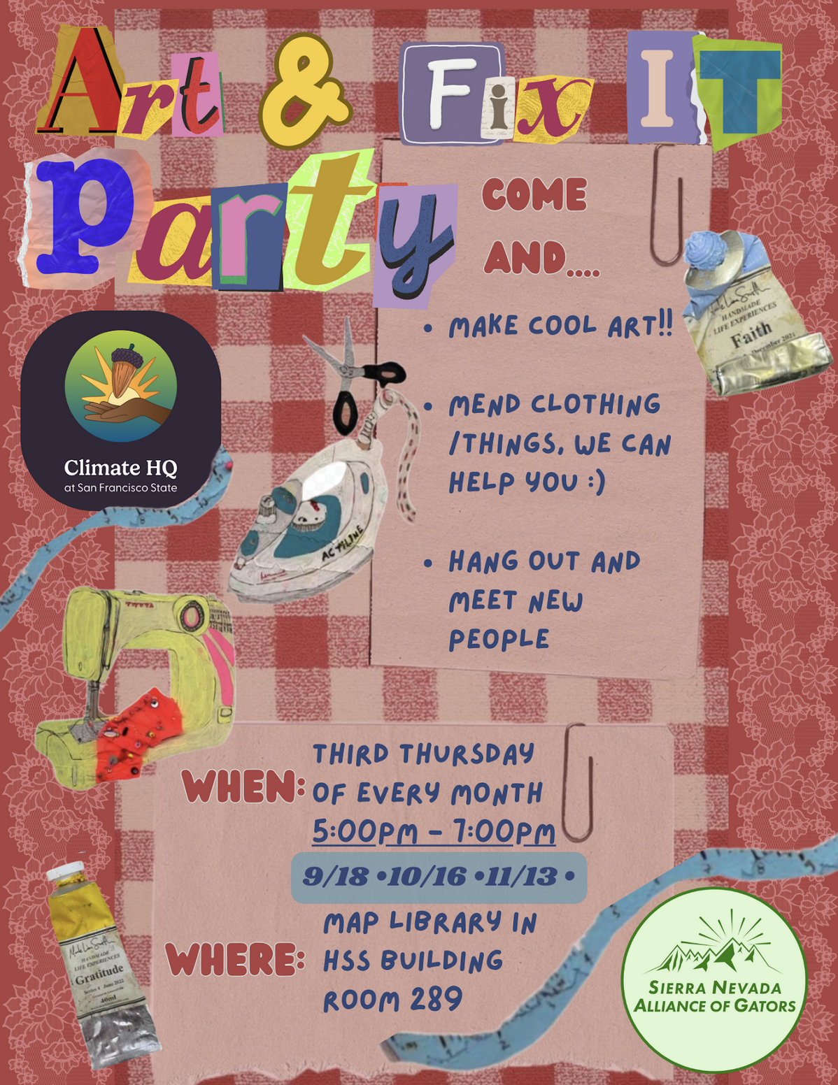 | | | | Bring along an art project you’re working on, some supplies to share, items that are often thrown away to turn into an upcycled craft, or even a piece of clothing that needs a little repair love. Life can get stressful, so we’re creating a relaxed space to slow down, connect, and let your creativity flow together in community. Don’t have anything to bring? No worries—we’ll have of art supplies, canvases, craft materials, and repair/embroidery tools ready for you, thanks to SCRAP and donations from our first Art & Fix-It Party last Earth Week! What are the origins of this art & fix-it party? Our very first Art & Fix-it party was at Climate HQ's Earth Week Spring 2025. | | "Fix-It Clinics” actually started in Minneapolis, Minnesota in 2009, founded by Peter Mui. The idea was to bring people together to repair broken household items instead of throwing them away—things like electronics, appliances, clothing, and toys. Informal art parties gatherings have long been part of neighborhood and grassroots culture, where friends and community members come together to create, share materials, and celebrate creativity outside of formal art spaces. With one of SNAGs core missions being connecting community & the environment, we thought this was a wonderful idea to create community by combining sustainability and creativity. We hope to see you there! | | Muir Woods National Monument! | | |