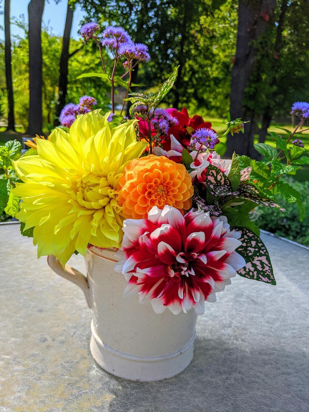 I love dahlias and have been growing them for years. Just when other flowers are giving out, dahlias put on their best show. Flowers vary in color, size and type and are easy to grow. They do best staked, in full sun & like fertilizer that is low in nitrogen. (Stake them when planting the tubers.) Dahlias are wonderful as cut flowers - put freshly cut stems in hot water to start and they will last longer.