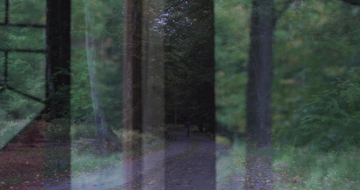 Image Description: In this still image from Khary Saeed Jones' work-in-progress "Night Fight", a person walks in the background on a path through a wooded area. In the foreground, the reflections or superimpositions of several vertical shapes, including the grilles of a window frame, a wooden support beam, and a tree, all form a part of a complex composition, creating crisp transparency in some areas, and bright multi-layered abstraction in others. (Learn more about image descriptions)